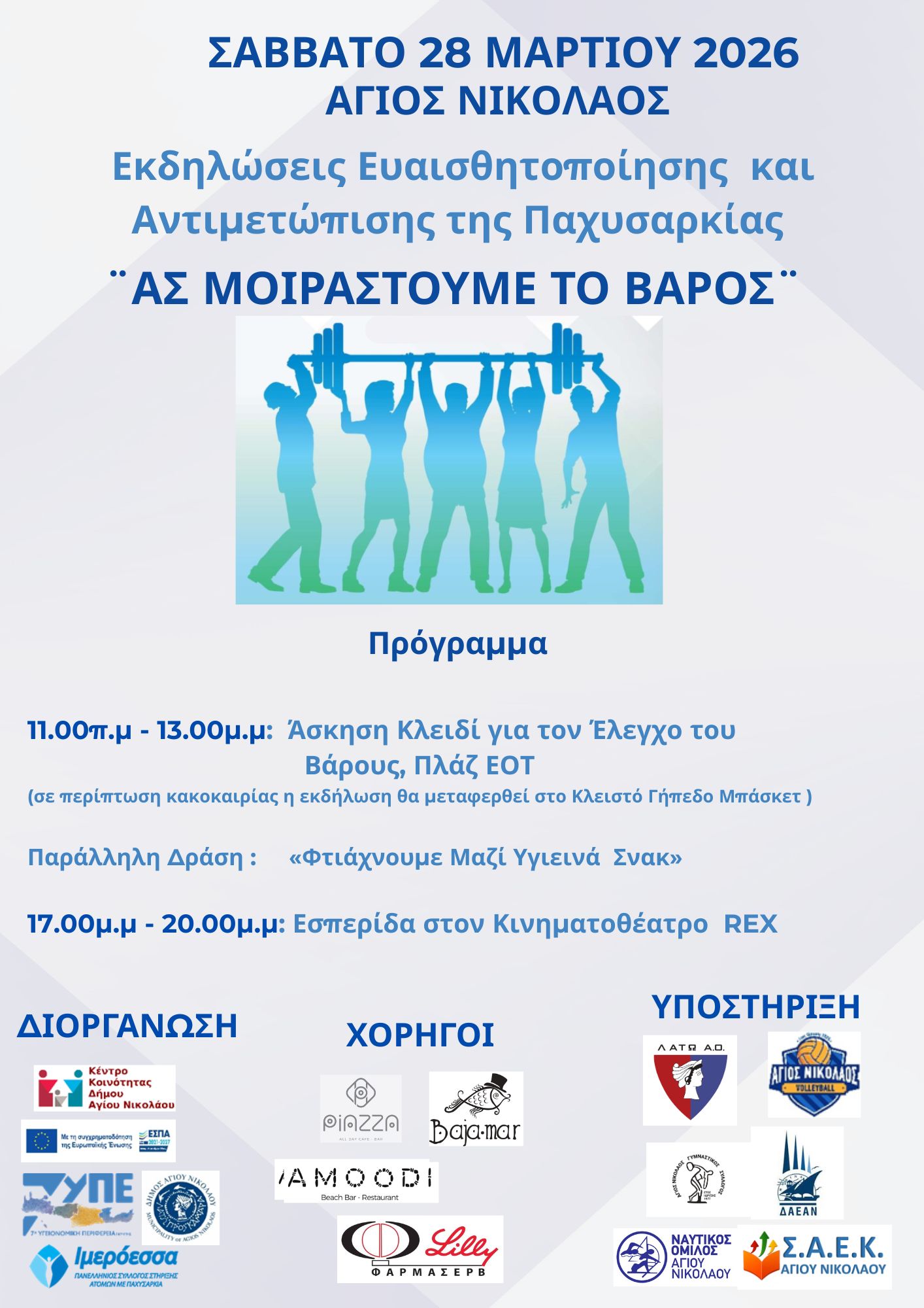 Η 7η Υγειονομική Περιφέρεια Κρήτης, ο Πανελλήνιος Σύλλογος Στήριξης Ατόμων με Παχυσαρκία Ιμερόεσσα – Επίσημος Φορέας Αντιμετώπισης της Παχυσαρκίας και ο Δήμος Αγίου Νικολάου διοργανώνουν δράσεις ενημέρωσης και ευαισθητοποίησης στον Άγιο Νικόλαο για την παχυσαρκία.