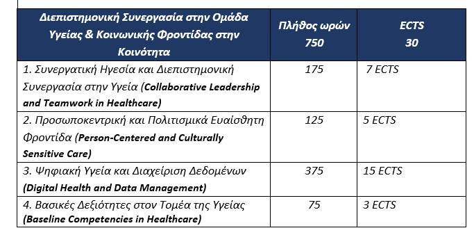 🩺 750 ώρες – 30 ECTS ή 4 Μικροδιαπιστευτήρια (Μicro-Credentials). Αυτό σημαίνει ότι μπορείτε να παρακολουθήσετε το σύνολο (750 ώρες) ή όποιο από τα τέσσερα ή συνδυασμό αυτών και να λάβετε βεβαίωση ή πιστοποίηση.