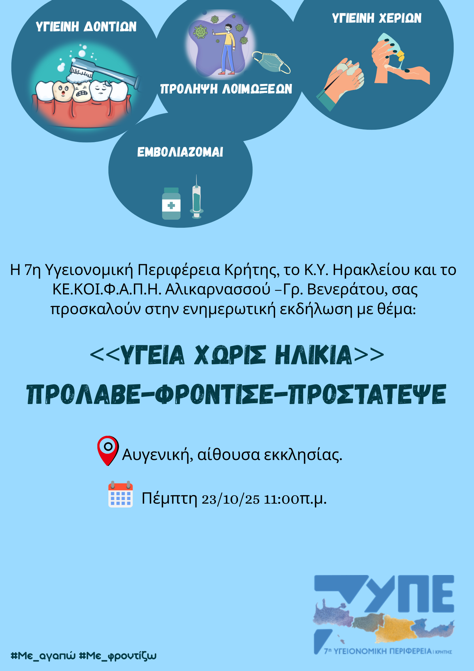 Εκδήλωση Ενημέρωσης και Πρόληψης στην Αυγενική Ηρακλείου «ΥΓΕΙΑ ΧΩΡΙΣ ΗΛΙΚΙΑ» ΠΡΟΛΑΒΕ – ΦΡΟΝΤΙΣΕ – ΠΡΟΣΤΑΤΕΨΕ
