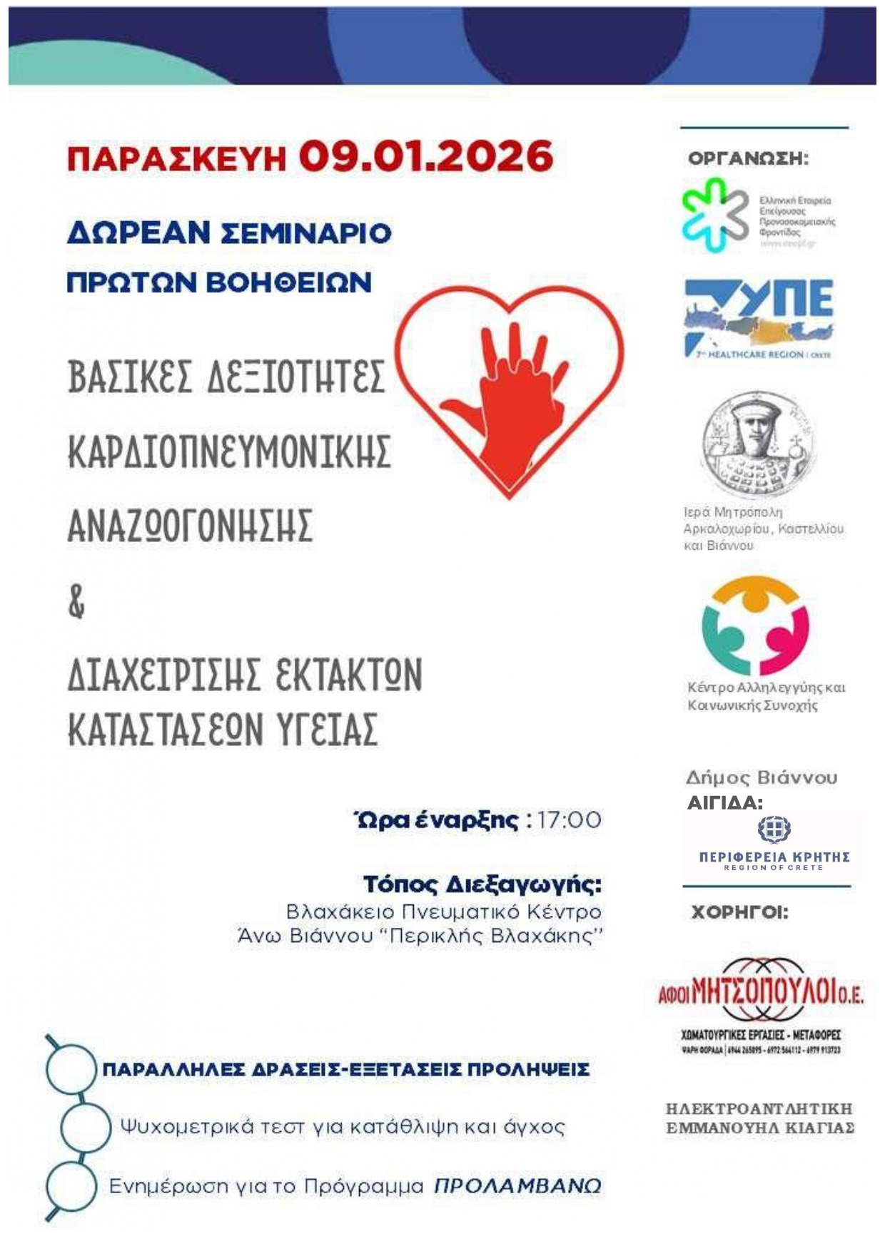 Η 7η Υγειονομική Περιφέρεια Κρήτης, η Ιερά Μητρόπολη Αρκαλοχωρίου, Καστελλίου και Βιάννου, το Κέντρο Αλληλεγγύης και Κοινωνικής Συνοχής και η Ελληνική Εταιρεία Επείγουσας Προνοσοκομειακής Φροντίδας, σε συνεργασία με το Δήμο Βιάννου και το Κέντρο Υγείας Βιάννου, σας προσκαλούν στο «Εκπαιδευτικό Σεμινάριο Πρώτων Βοηθειών» που θα πραγματοποιηθεί στο Βλαχάκειο Πνευματικό κέντρο Άνω Βιάννου ¨Περικλής Βλαχάκης¨ την Παρασκευή 09.01.2026, ώρα 17.00μμ