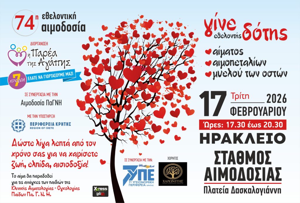 Τρίτη 17 Φεβρουαρίου, 17.30-20.30 μ.μ., στο σταθμό αιμοδοσίας Πλατεία Δασκαλογιάννη, στο Ηράκλειο