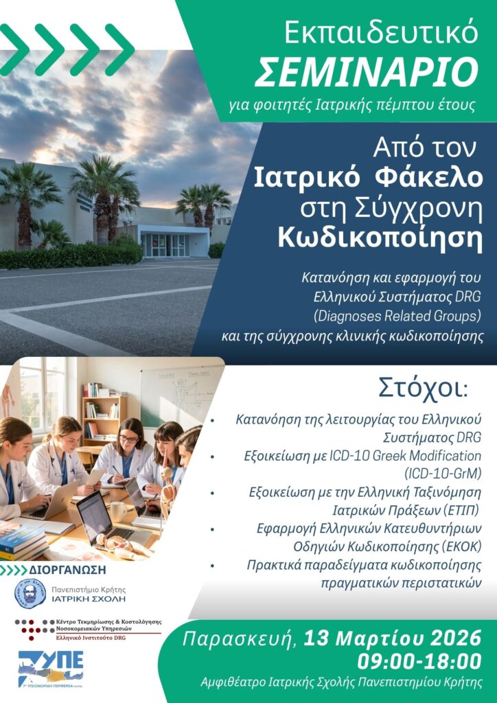 Στις 13 Μαρτίου 2026, στην Ιατρική Σχολή του Πανεπιστημίου Κρήτης, διοργανώνεται το πρώτο εκπαιδευτικό σεμινάριο στη χώρα με αποκλειστικό αντικείμενο το Ελληνικό Σύστημα DRG και αποδέκτες προπτυχιακούς φοιτητές Ιατρικής (φοιτητές πέμπτου έτους).