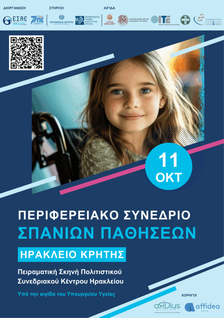 Η Ένωση Σπανίων Ασθενών Ελλάδος (Ε.Σ.Α.Ε.) και η 7η Υγειονομική Περιφέρεια Κρήτης, με την υποστήριξη της Περιφέρειας Κρήτης και του Περιφερειακού Ταμείου Ανάκαμψης Κρήτης, διοργανώνουν το 2ο Περιφερειακό Συνέδριο Σπανίων Παθήσεων, στις 11 Οκτωβρίου 2025, στην Πειραματική Σκηνή του Πολιτιστικού Συνεδριακού Κέντρου Ηρακλείου.